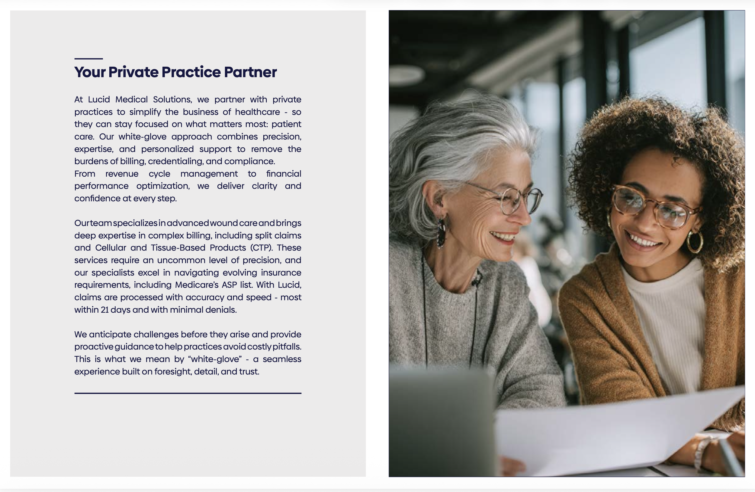Lucid Medical Solutions has refreshed its brand and launched a new website to reflect the sophistication of the clients, care models, and revenue cycle challenges we support today. As our work has expanded into increasingly complex reimbursement environments, our identity and digital presence have evolved to more clearly represent the clarity, discipline, and depth of expertise we bring to every engagement.